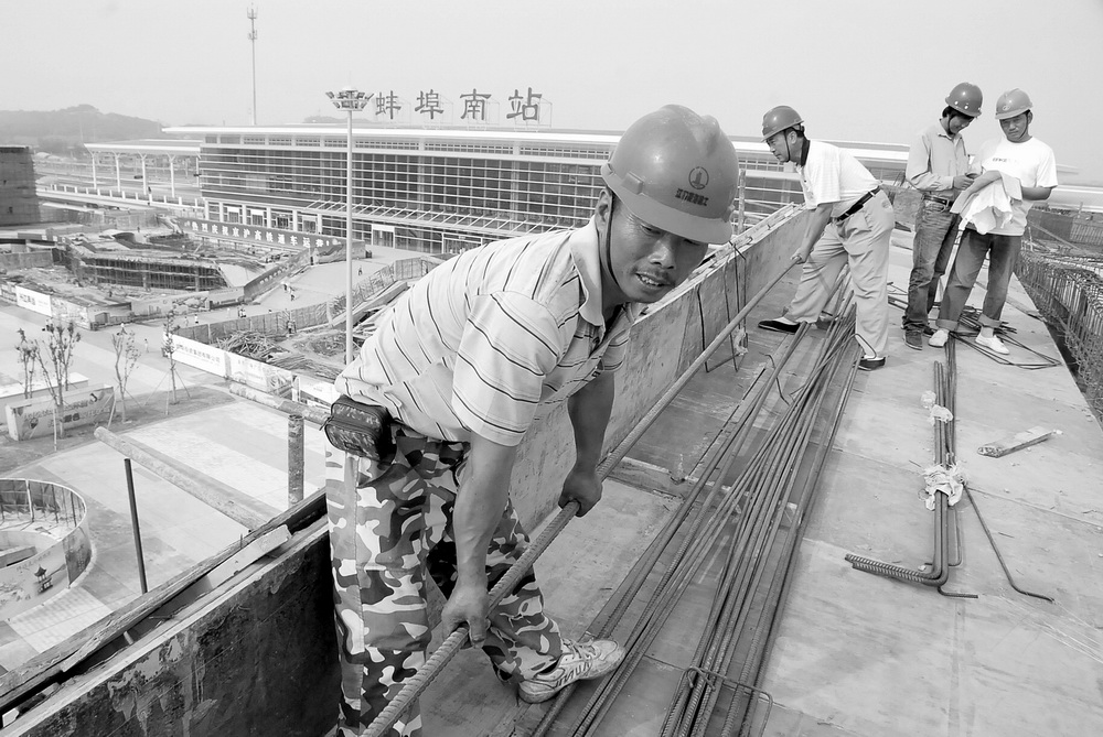 7月13日,施工人員在進(jìn)行蚌埠南站配套服務(wù)樓屋頂鋼筋綁扎施工。據了解,高鐵蚌埠南站配套服務(wù)樓主體施工進(jìn)入尾聲,16日將開(kāi)始進(jìn)行混凝土澆灌封頂施工。