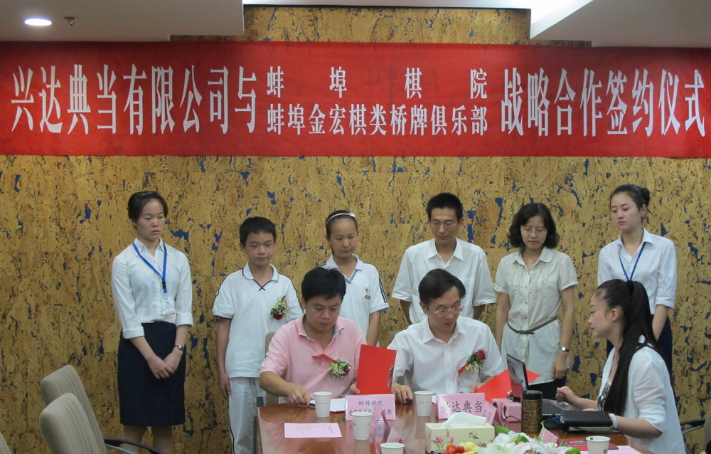 914,興達典當有限公司與蚌埠棋院社、金宏棋類(lèi)橋牌俱樂(lè )部簽訂合作協(xié)議。體育局副局長(cháng)周青山、興達典當總經(jīng)理陳孝凱及蚌埠棋院負責人等出席簽字儀式。
