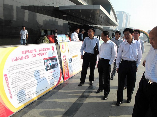 10月12日上午,在淮河文化廣場(chǎng)上,興達典當有限公司作為蚌埠市典當拍賣(mài)協(xié)會(huì )會(huì )長(cháng)單位應邀參加了由市商務(wù)局牽頭,聯(lián)合市委宣傳部、市文明辦、市物價(jià)局、市經(jīng)信委等17個(gè)部門(mén)共同舉辦的以“凝聚誠信力量,實(shí)現中國夢(mèng)想”為主題的誠信興商大型宣傳活動(dòng),市人大、市政協(xié)及市商務(wù)局領(lǐng)導現場(chǎng)巡視了各單位宣傳展板并與在場(chǎng)人員熱烈交流。