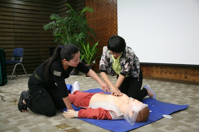培訓中,授課老師介紹了紅十字會(huì )的起源及主要職責,結合案例詳細講解了創(chuàng )傷救護、常見(jiàn)急癥、意外傷害等現場(chǎng)救護知識,重點(diǎn)演示了徒手心肺復蘇急救技術(shù)的動(dòng)作要領(lǐng),并邀請學(xué)員上臺親身嘗試。培訓過(guò)程講解生動(dòng),內容貼近工作生活實(shí)際,現場(chǎng)秩序井然。