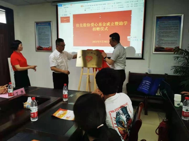 儀式現場(chǎng),佳先股份副總經(jīng)理、工會(huì )主席丁柱介紹了公司發(fā)展及參與公益事業(yè)的情況;區委常委、常務(wù)副區長(cháng)程旭和佳先股份董事長(cháng)李兌共同為“佳先股份愛(ài)心基金”揭牌;佳先股份愛(ài)心基金向沫河口鎮學(xué)生捐贈10萬(wàn)元。